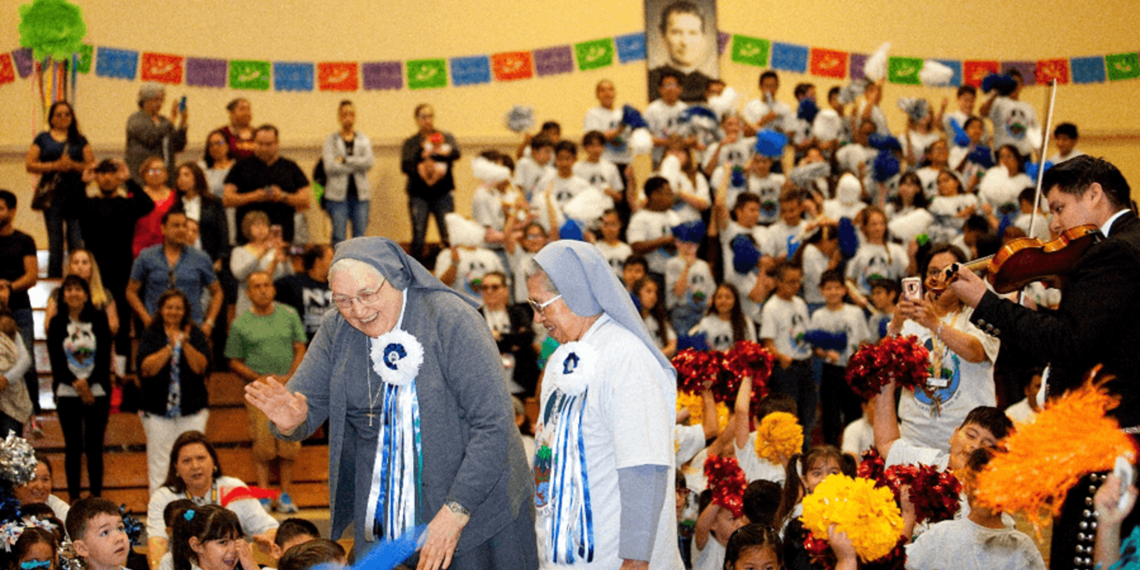 Students and faculty welcome Mother Yvonne to the school assembly at St. John Bosco School in San Antonio, TX.