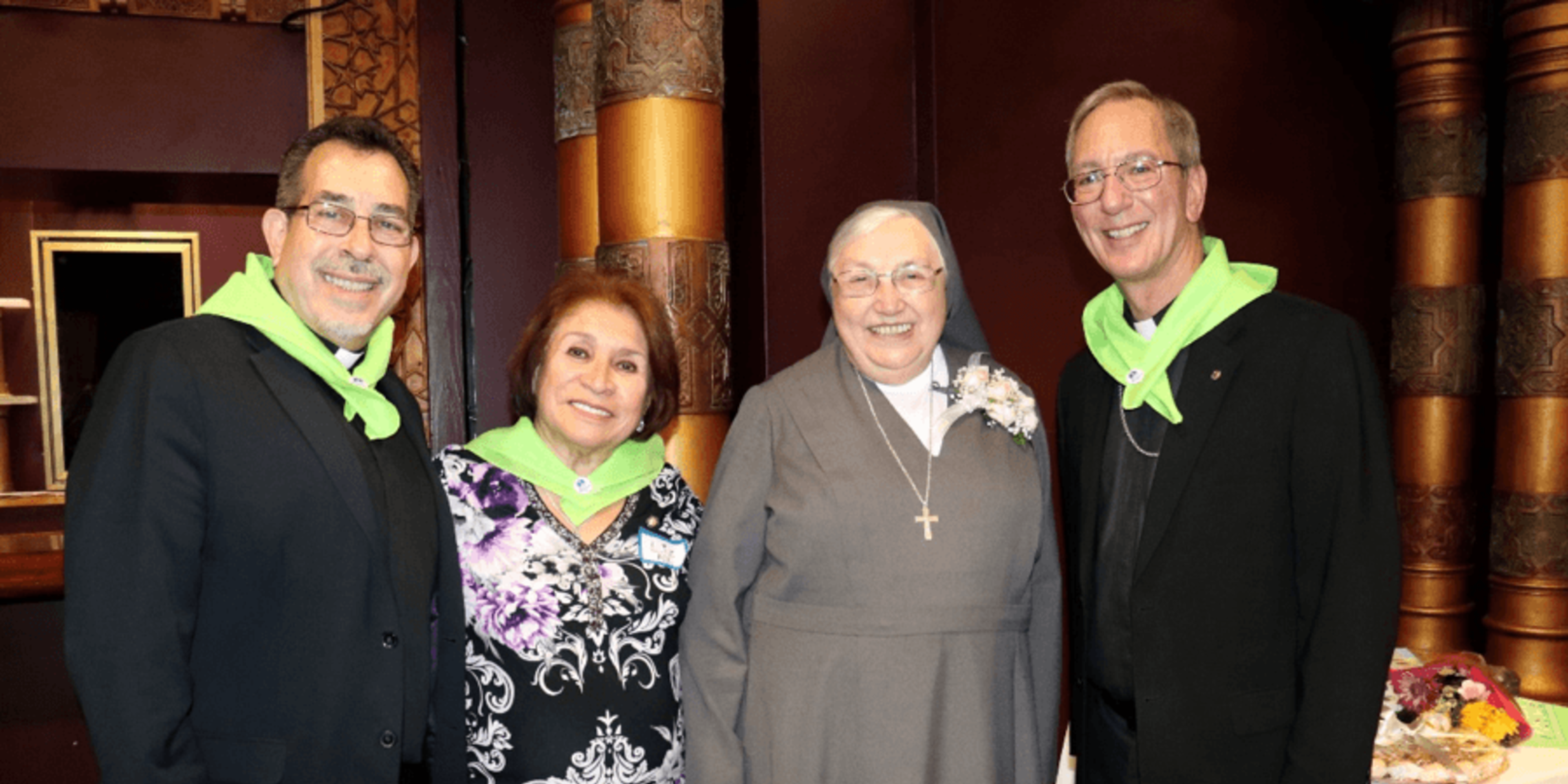 Mother Yvonne greets various dignitaries during the World Gratitude Day Luncheon in Bellflower, CA. Fr. Ted Montemayor, SDB (Western Province Salesian Provincial), Elizabeth Gamarra (Salesian Family Delegate), Mother Yvonne and Bishop Marc Trudeau (Auxiliary Bishop of the Archdiocese of Los Angeles)
