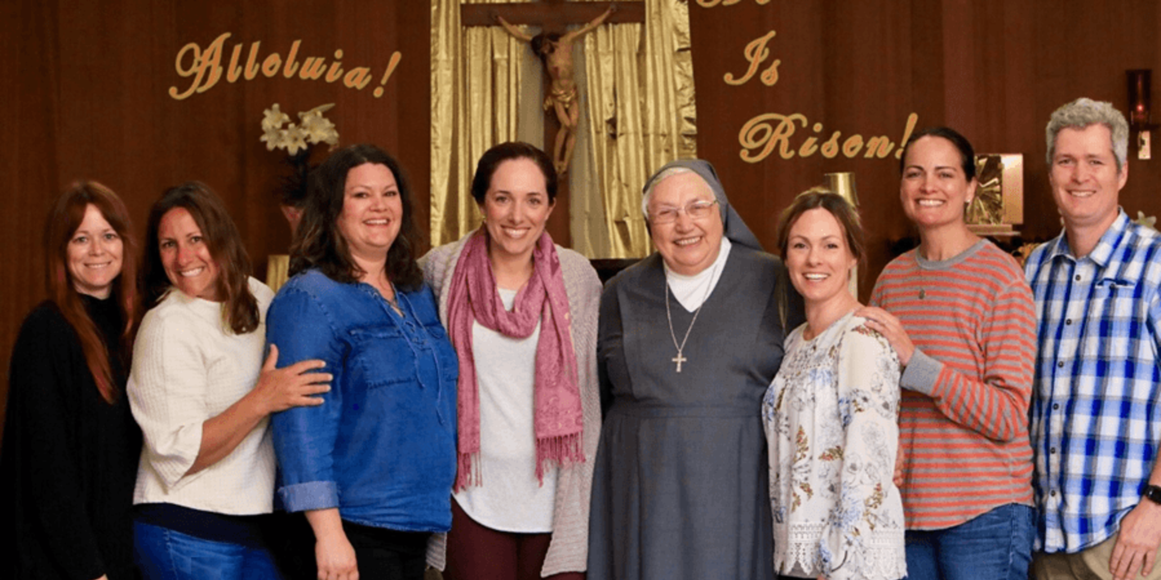 Mother Yvonne is welcomed by the Salesian Parent Leadership Team at Salesian Elementary and Jr. High School in Corralitos, CA. Adrian Race, Natalie Candau, Nichole Dewig, Lisa Flynn, Mother Yvonne, Kate Tofig, Liz Findrick and Jeff Randolph