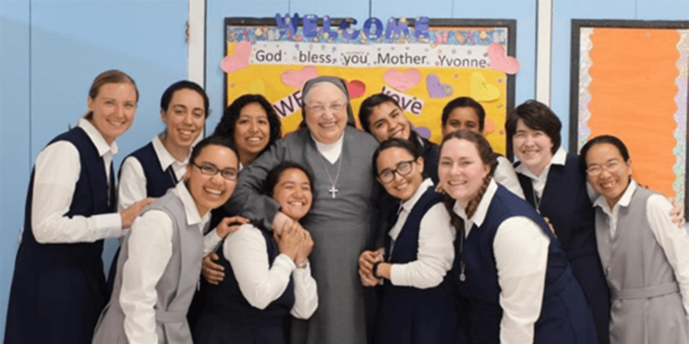 Candidates, Postulants and Novices Gathering with Mother Yvonne Reungoat at World Gratitude Day. Back Row: Rose Wingard, Natasha Roig, Claire Ramos, Mother Yvonne Reungoat, Valeria Jiménez, Shaila Mathai, Genevieve Metzger, and Sr. Lien Phan Front Row: Sr. Cherilly Galley, Chelsy Sánchez, Brithany Gutiérrez Bustillo and Anne Weis
